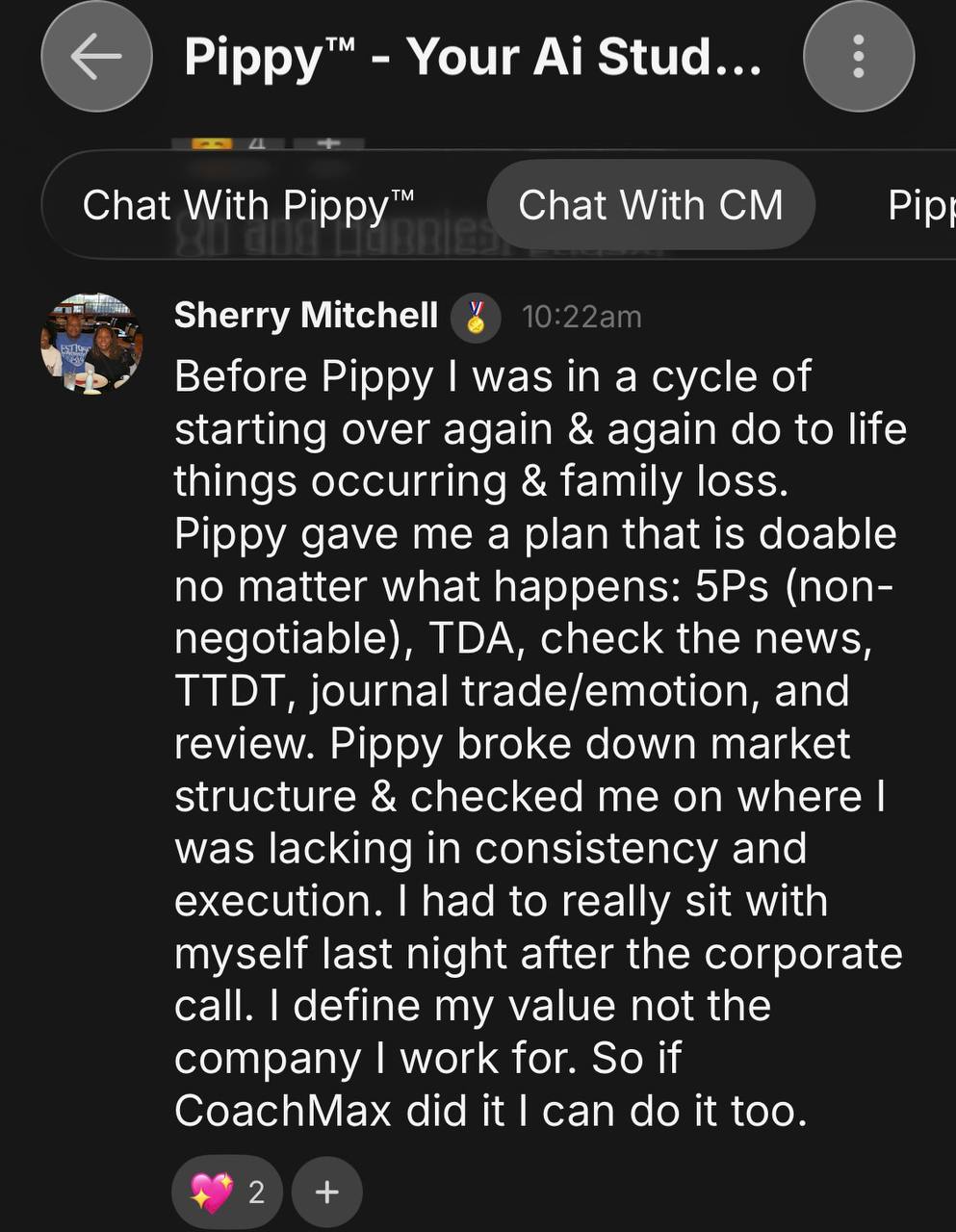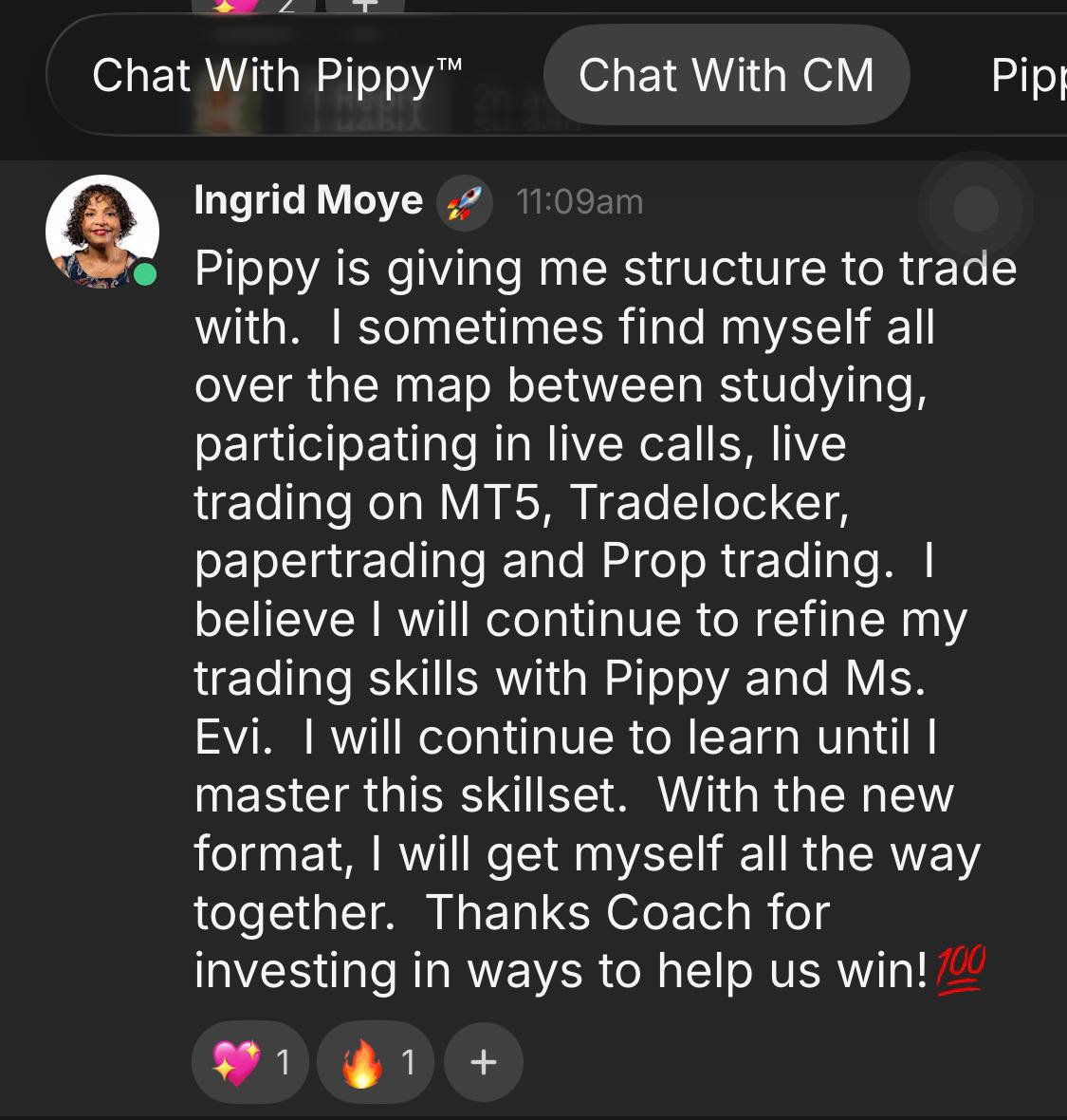 A: Perfect, Pippy™ is your performance optimizer. She’ll help you tighten discipline, refine entries, and build habits that make you trade like a funded professional.